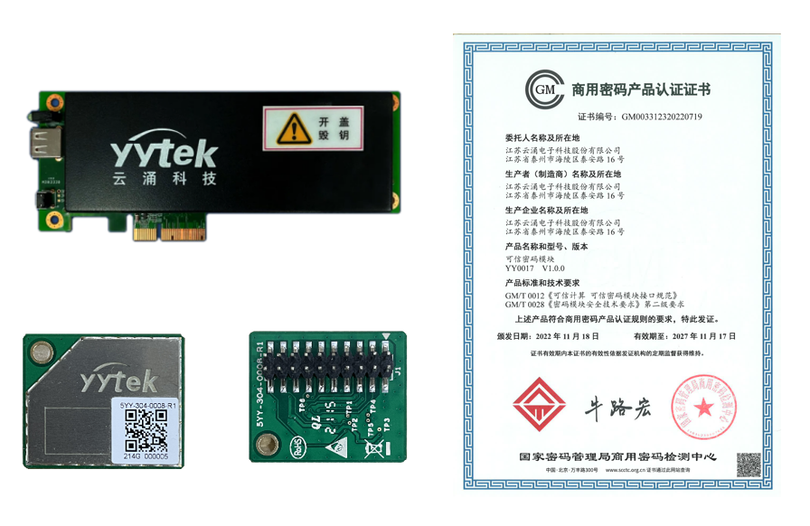 YY0017可信密码模块基于可信计算核心思想和基本架构,依据等级保护2.0要求,采用国芯安全芯片,是可信计算密码支撑平台必备的关键基础部件,作为硬件和固件的集合,可以为整个可信计算提供独立的密码算法支撑,支持SM1/ SM2/SM3/SM4等国密算法,符合国密认证标准,已取得GM/T 0012可信密码模块证书。
