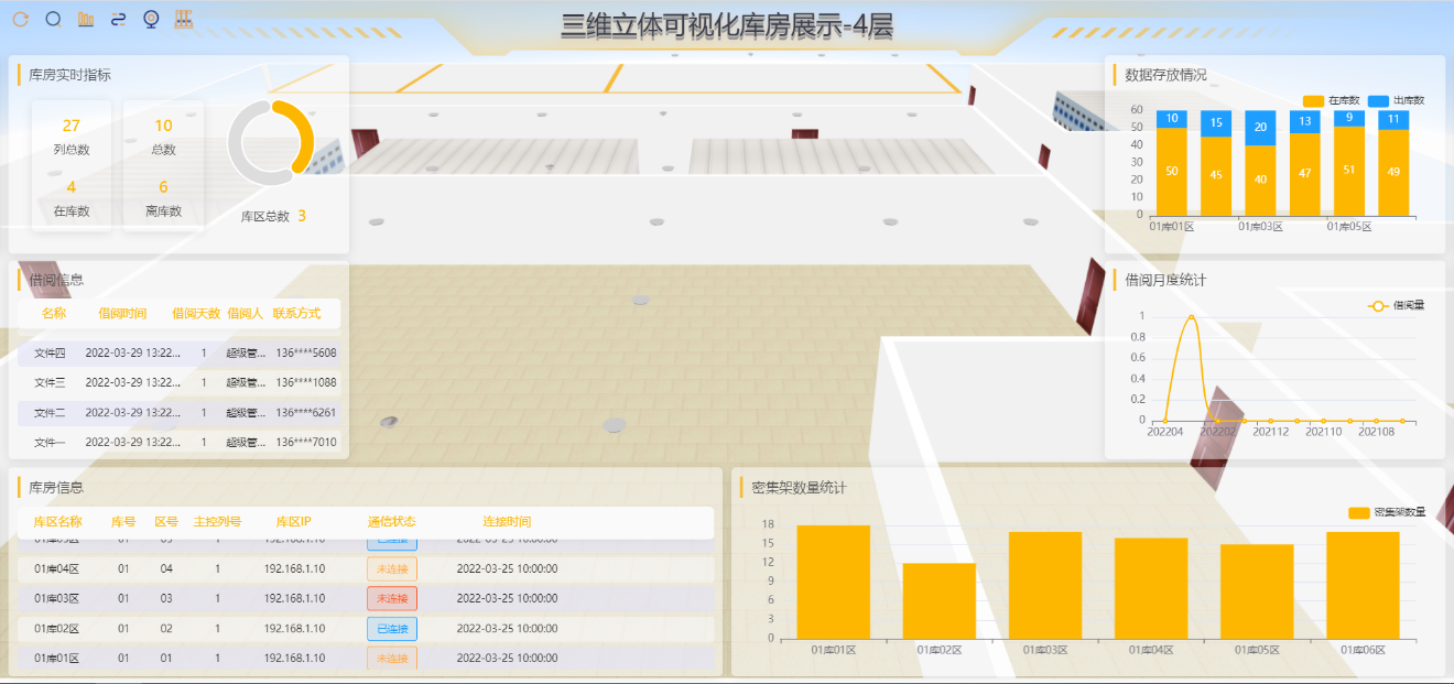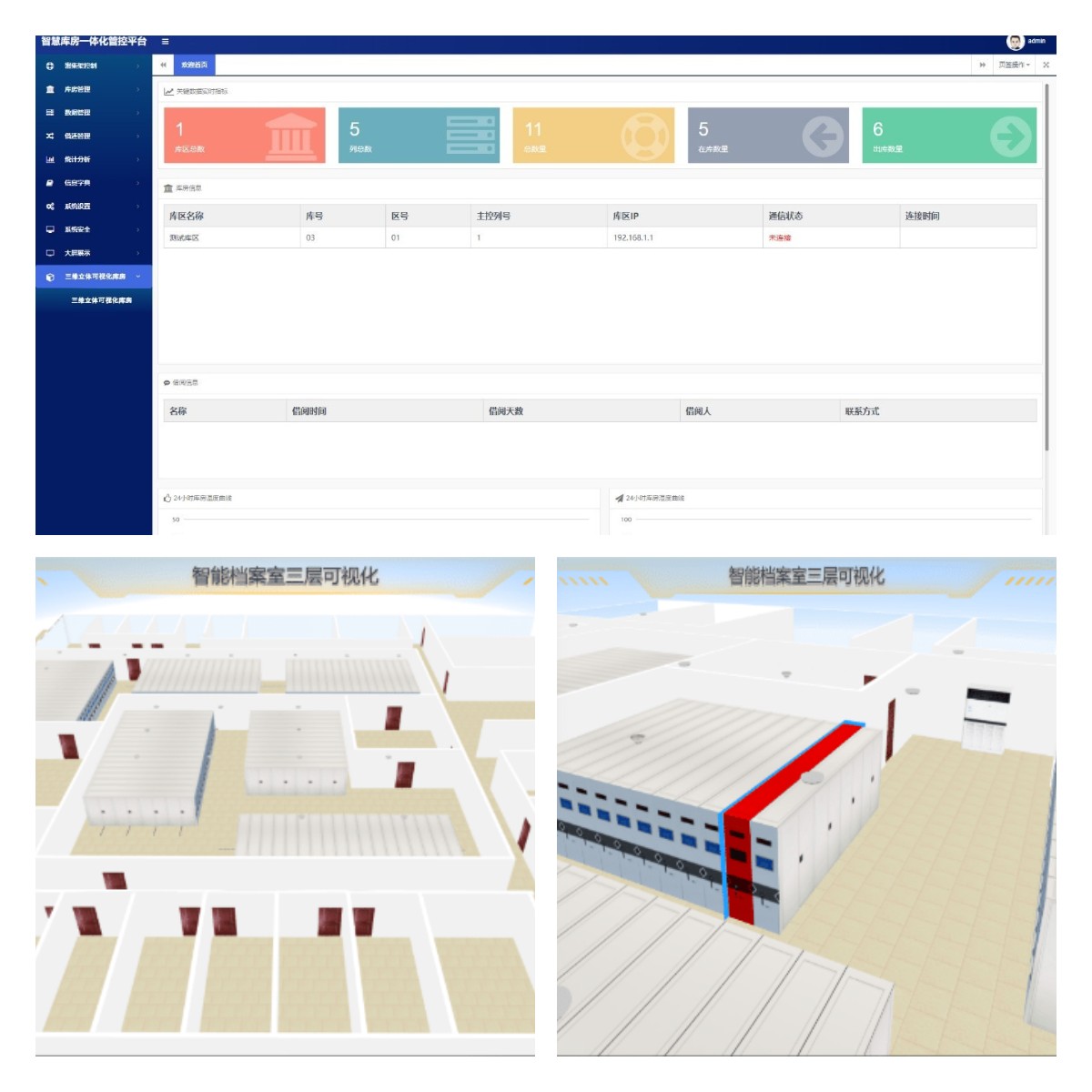 本系统结合用户的深度业务逻辑,通过Three.Js三维可视化技术搭建数字孪生模型,使用IOT技术、运行历史数据,多尺度、多概率的仿真过程,在虚拟空间中完成映射,将真实设备与数字模型进行耦合交互,实现设备实时运行状态与数字孪生对象动作对应(支持密集架开启、关闭、查询文件等)。
