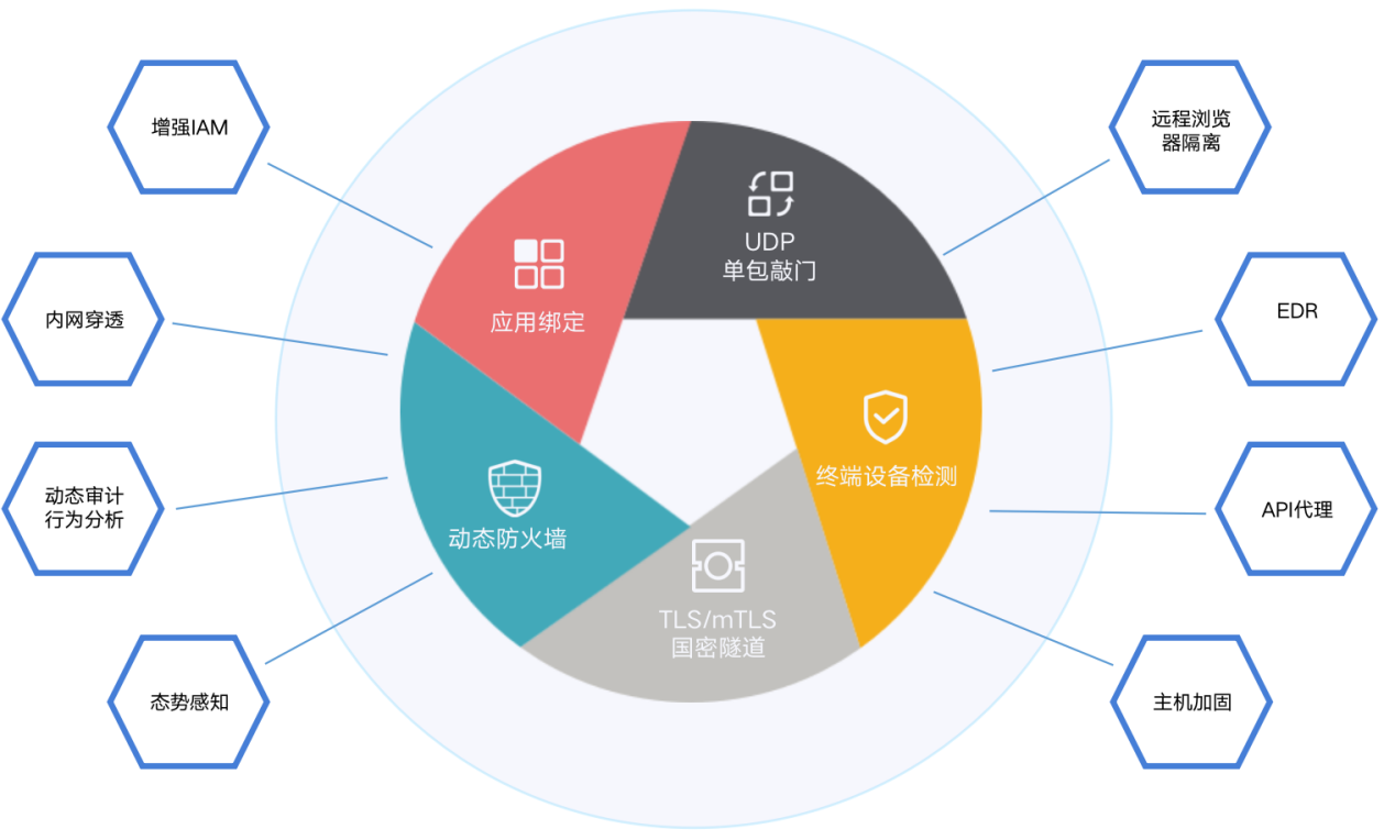 零信任网络访问平台融合了当前最新的安全技术,通过联动的安全矩阵设计,形成一个整体的安全闭环。安全矩阵主要包括:SDP安全框架,远程浏览器隔离,增强IAM, 内网穿透,动态审计与行为分析,态势感知,端点检测与响应EDR,主机加固,API代理等。
