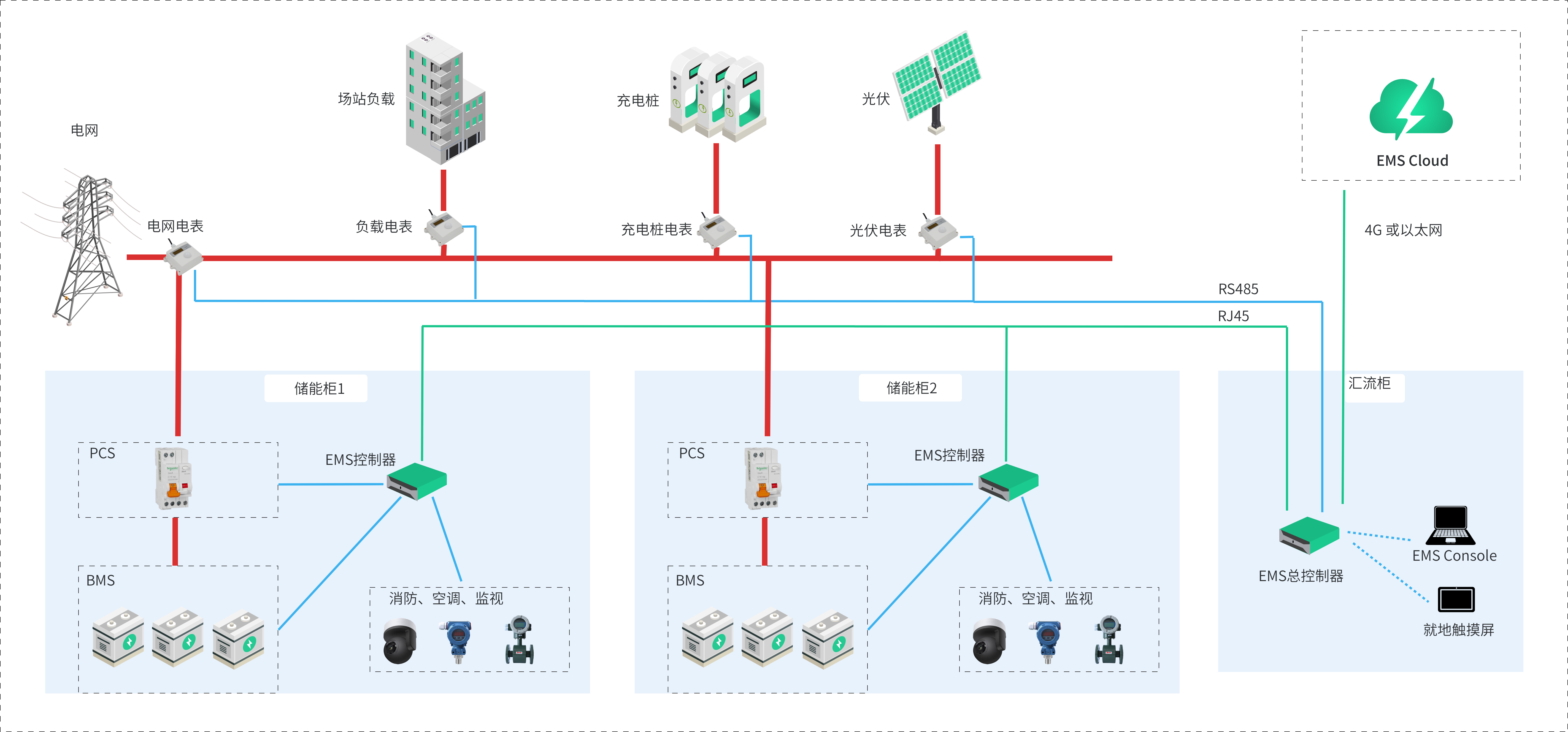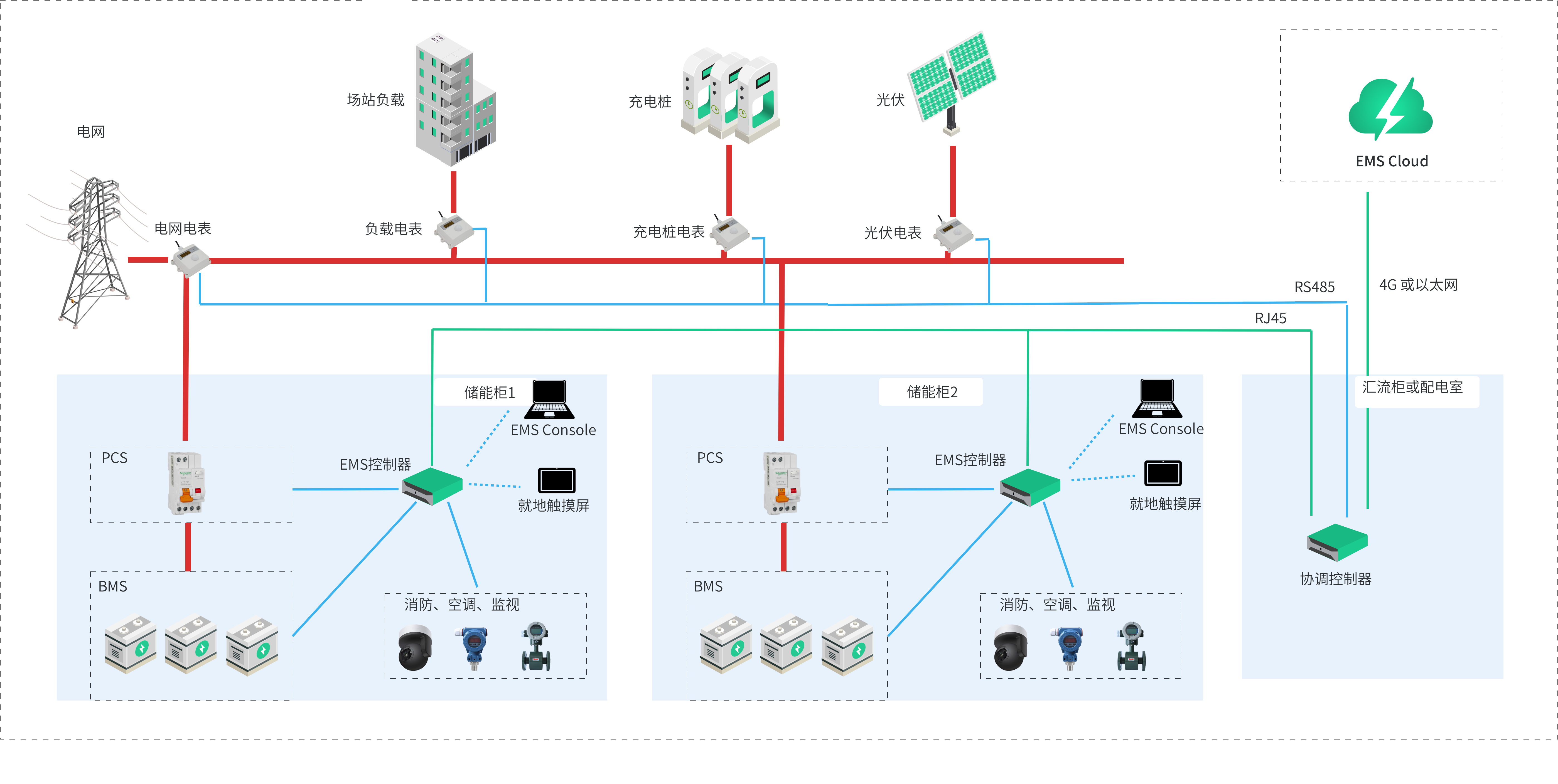 针对以上问题,澳门新葡京博彩推出了储能EMS系统的并柜方案,通过将多台储能柜并联在一起,相互协同工作,为用户提供更大的功率输出和储电容量。该方案综合考虑储能系统的设备间协调控制、能源流转协调、安全设计和控制策略等多个方面,在显著提升系统的稳定性和可靠性的同时,也能更好地应对电力储能的不同需求。